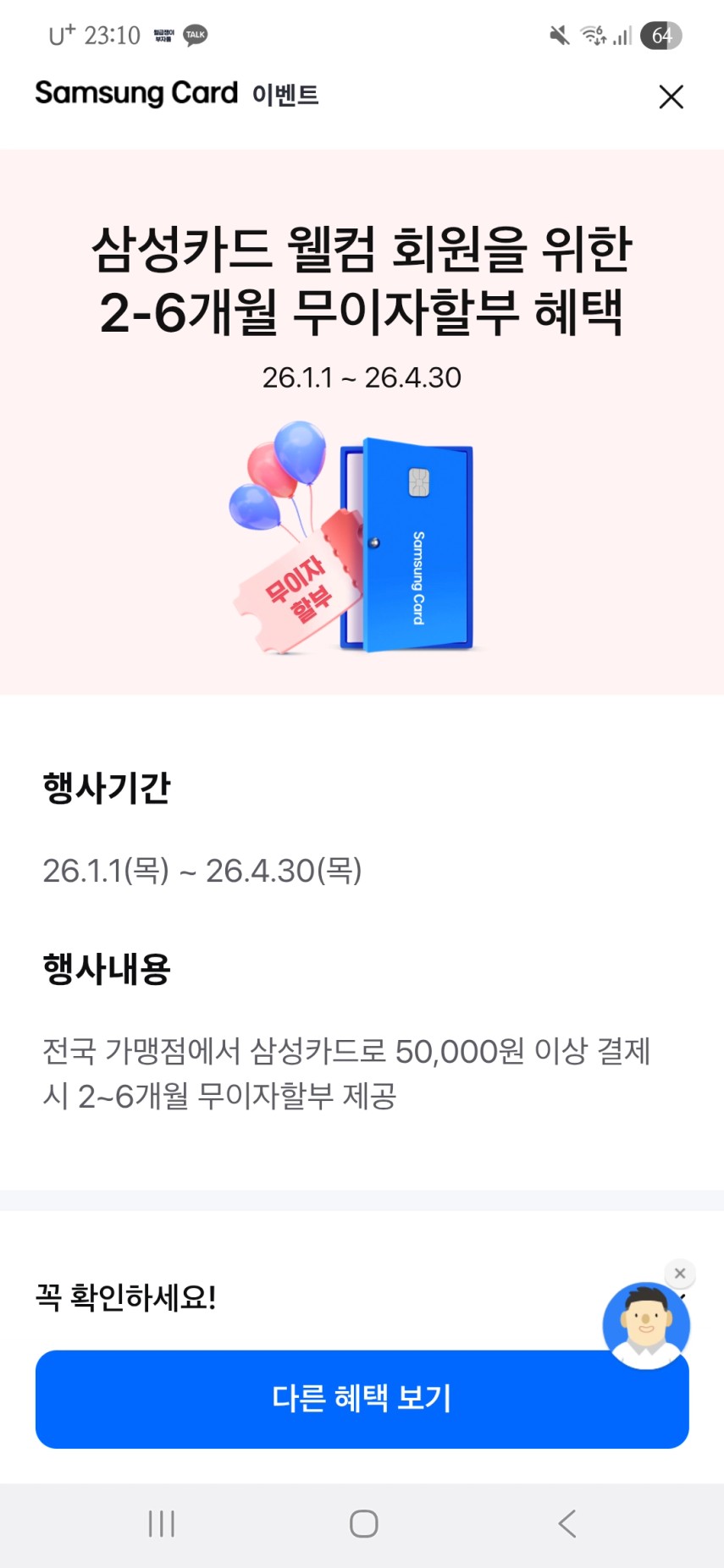 웰컴혜택 부분에 들어가셔서 두 번째 사진의 2-6개월 무이자 혜택이