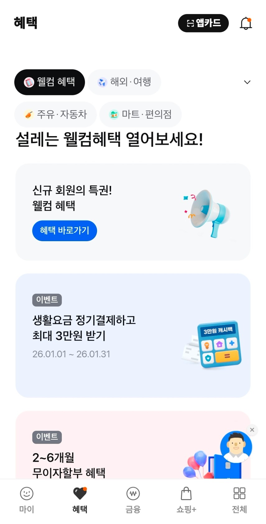 참고로 카드신청을 하고 나서 ‘웰컴혜택’ 부분이 활성화 됩니다.