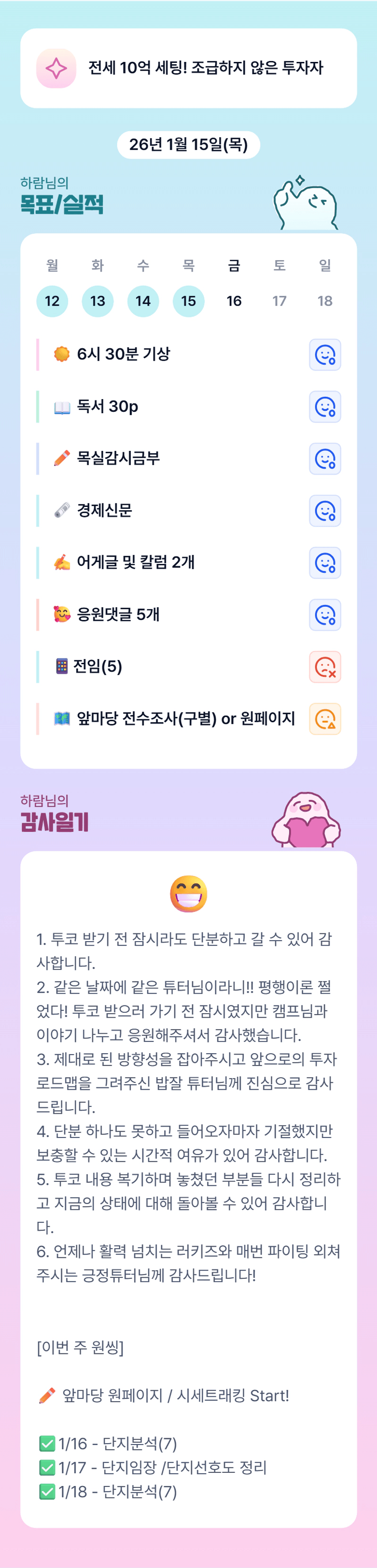 나는 새 임차인과 전세계약을 무사히 체결한다.나는 매일 성장하고 발전한다.나는 내 삶에 만족하며 행복할 자격이 있다.나는 상황을 감정이 아니라 차가운 머리로 판단한다.나는 10억을 감당할 만한 그릇을 갖출 수 있다.나는 부채는 두려워하지 않지만 통제하지 못하는 부채는 절대 허용하지 않는다.나는 항상 좋은 동료들과 함께 한다.나는 2030년에 순자산 10억을 달성한다.