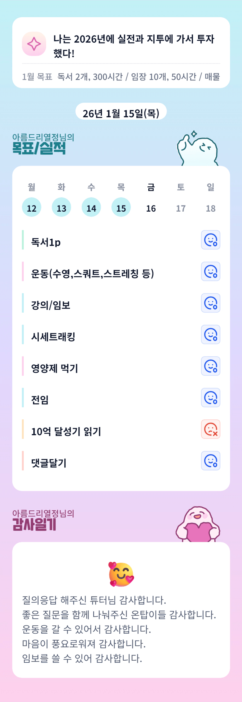 운동....아까 보여주신 천억부자들이 생각나는군요.. 마음도 풍요롭고 경제적으로도 풍요롭고 싶습니다. 오늘도 고생 많으셨습니다!!