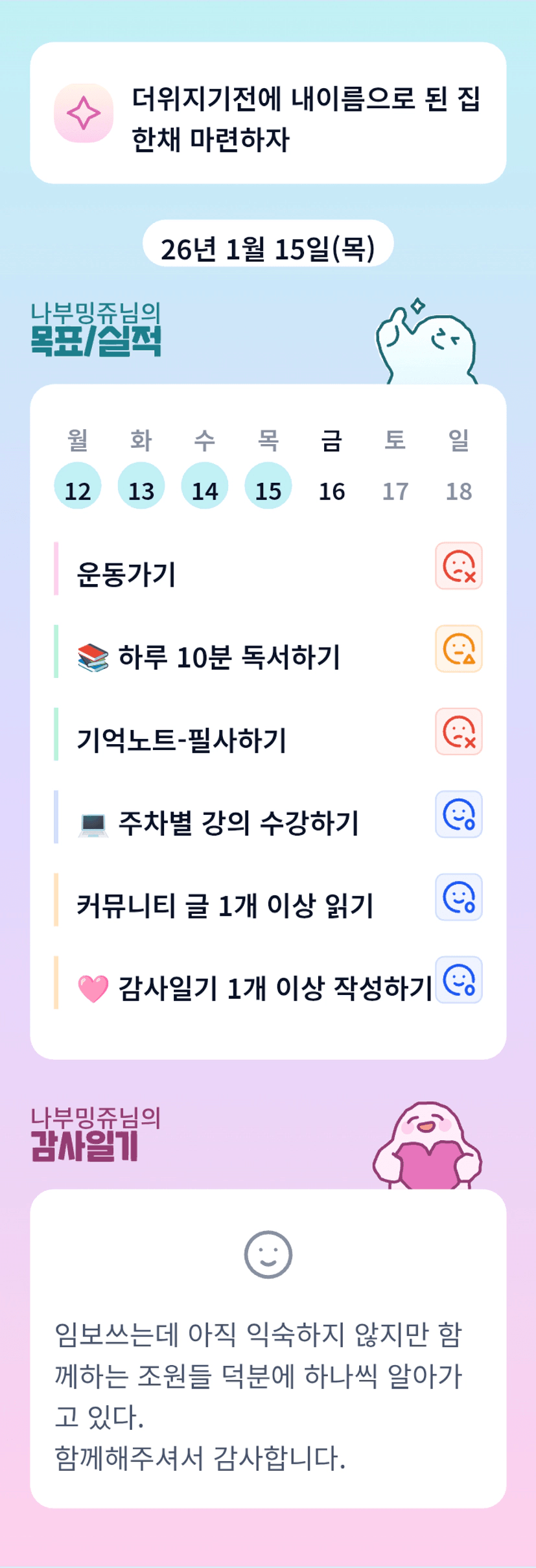 밍쥬님~~ 임보 쓰기가 참 만만치 않고 어렵지만 시간과 노력이 쌓이다보면 조금씩 익숙해질거예요. 우리 같이 노력해요❤️❤️