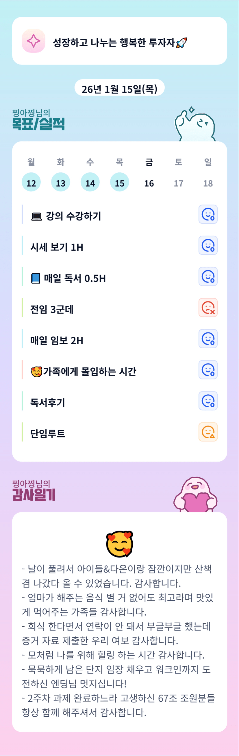 늘 하루를 알차게 쓰시면서 조원들까지 잘 챙겨주시는 울조장님! 같은 직장맘 투자자여서인지 조장님보며 더 열심히하게되는것같아요~ 우연히 본 목실감에 제 얘기가 있다니 감동입니당 :)