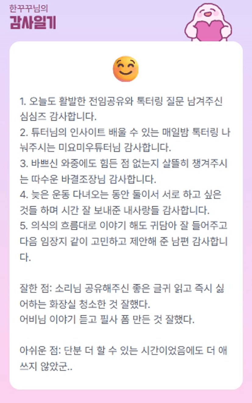 꾸꾸님은 수용력이 진짜 좋으신거 같아요!ㅎㅎ 늘 배웁니다💖 믓찐 동료 꾸꾸님 이따 만나유ㅎㅎ