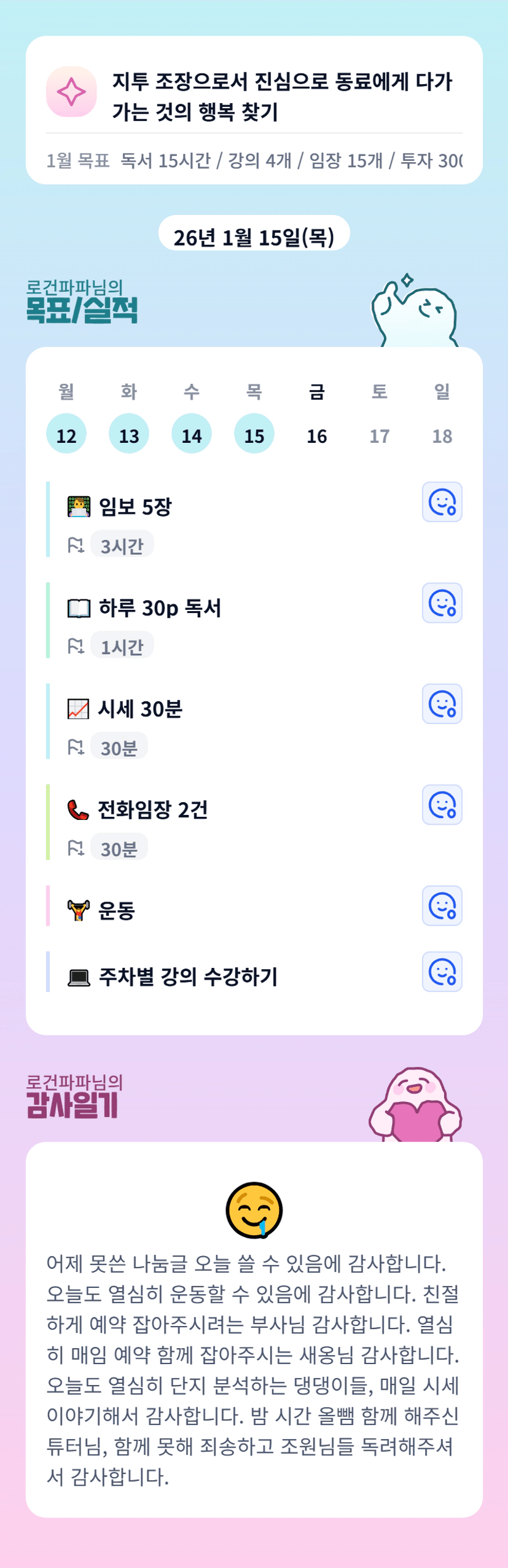 계획한 모든일 다 해내신 조장님 정말 대단하세요 !! : ) 진심 넘치게 느껴져서 저도 너무 감사합니다 ~!