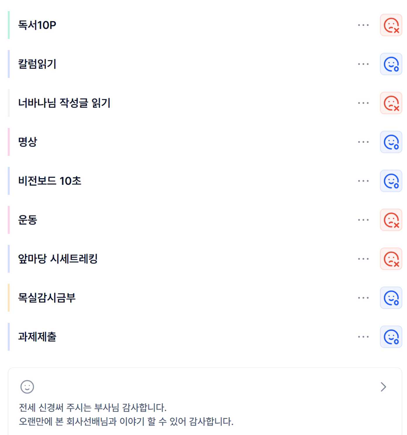 나는 건강한 사람이다.나는 부단히 노력하는 성실한 사람이다.나는 2026년 서울, 수도권 앞마당 10개 늘린다.나는 2028년 4호기 투자하고 순자산 15억 달성한다.나는 2030년 5호기 투자한다.꾸준함은 성공의 최고 덕목이다. 나는 꾸준히해서 2035년 30억 부자가 된다.나 우가행은 해내는 사람이다.나는 한다.나는 해낸다.나는 반드시 된다.