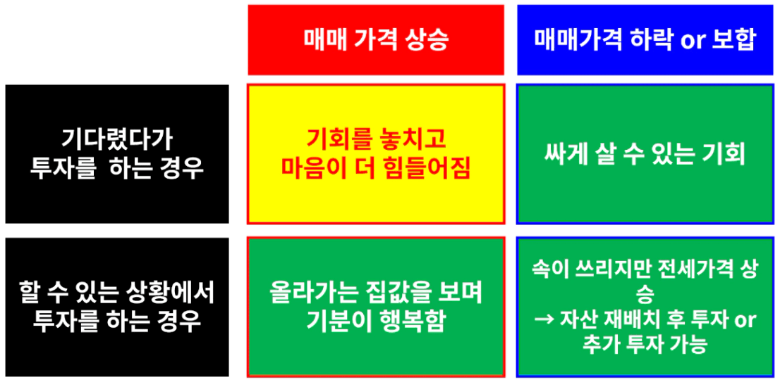 물론 비싼 가격에 사는 것은 조심해야겠지만 비싸지 않은 가격에 충분히 내 상황에서 투자할 수 있다면 막연히 기다리는 것이 아니라 할 수 있는 투자를 하는 것이 더 좋은 선택이라는 것이죠.