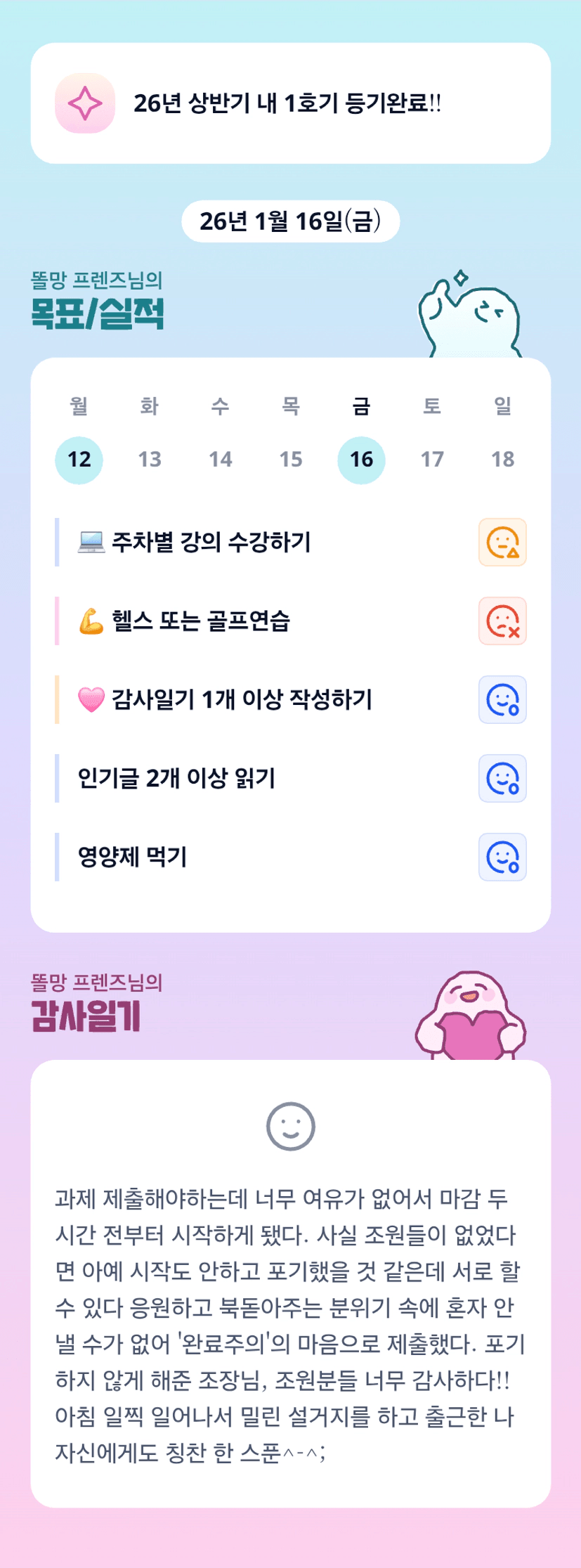 똘망님!! 느무 느무 잘하셨어요! 저도 혼자 했으면 그냥 안하고 포기 했을 것 같은데 이렇게 한조에 소속되어 더 잘해보고자 새벽에 잤네요.. 아오~~~ 피곤해~~~~~ ㅎㅎㅎㅎㅎㅎㅎ 그렇지만 뿌듯하고 기분 좋아요!! 똘망님 밀린 설거지 하셨구나.. 울집에도 밀린설거지 많은데 우리집 설거지도 하시는 김에 부탁드려요. 제가 칭찬 두스푼 드릴게요^^