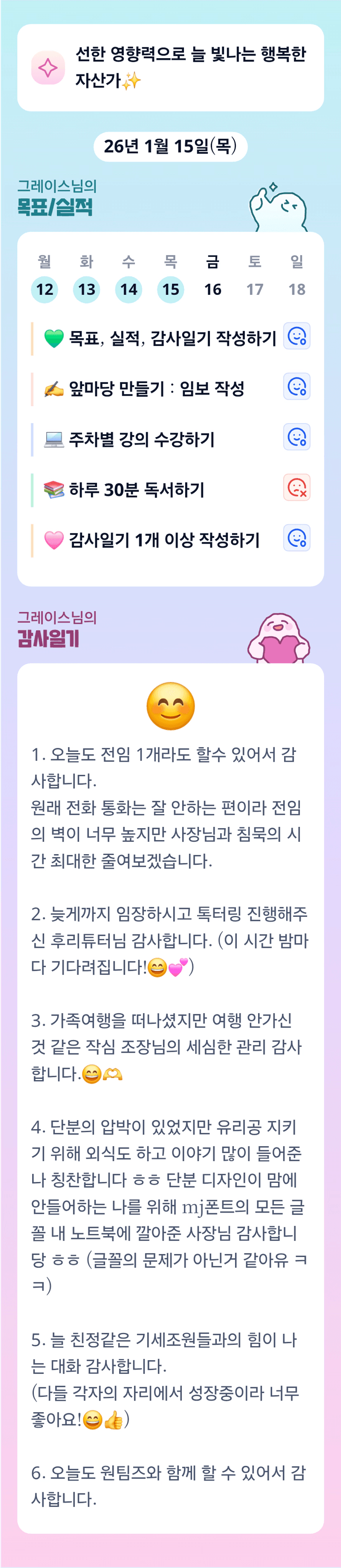 오아~그레이스님의 목실감은 항상 따땃합니다😄♨️폰트의 문제가 아닌데 어쩔까유😅 바쁘신 와중에 유리공도 잘 지키시고,대단하신 그레이스님,오늘도 파이팅해용