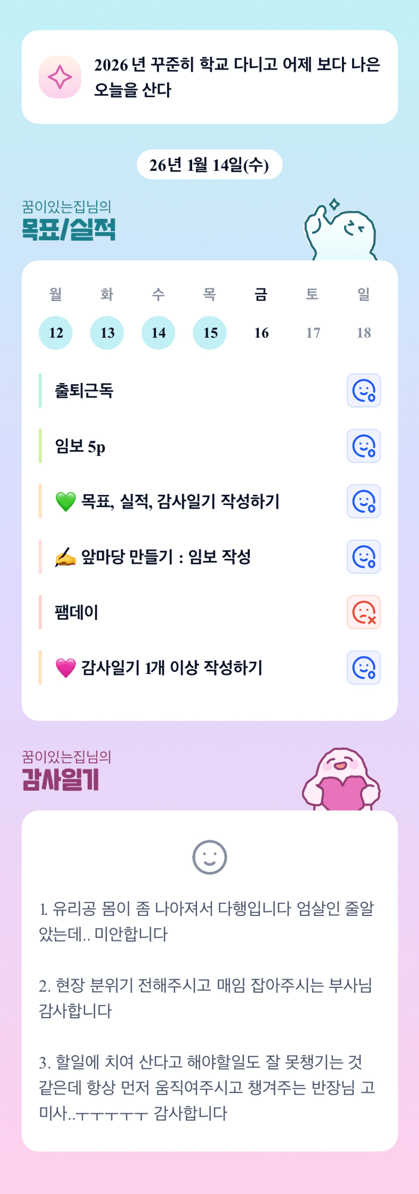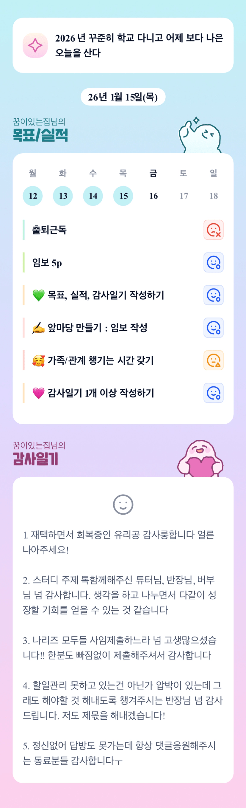 그 바쁜 와중ㅇ ㅔ목실감챙기고 칼럼요약하시는게 더 대단하세요!!! 그래도 유리공님 건강 좋아지셨다니 다행이네요!! 내일도 안전임장 빠이팅입니다!!
