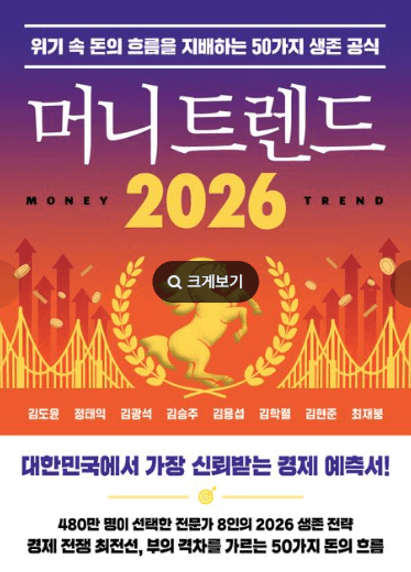 부의 흐름을 꿰뚫는 대한민국의 대표 8인의 인사이트를 볼 수 있었던 머니트렌드. 익히 알고 있는 김작가님, 김현준대표님, 부읽남님, 김광석님의 인사이트 뿐 아니라, AI산업, 새로운 화폐 코인, 라이프 트렌드와 같이 부동산에서 조금 벗어나 2026년은 어떤 트렌드로 돈의 흐름이 바뀌고 예상되는지 볼 수 있다.