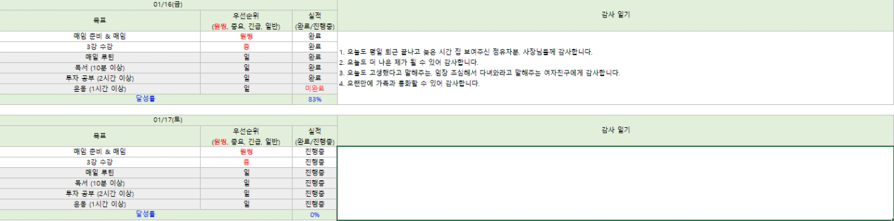 🌻1/17 목표, 1/16 실적 & 감사일기