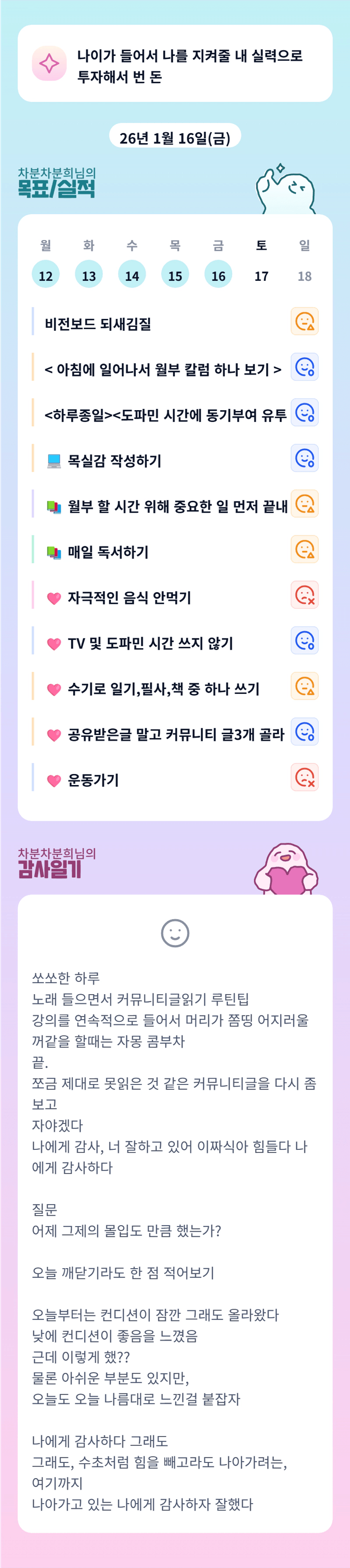 ㅋㅋㅋㅋ 하루 회고록처럼 남기는것도 나쁘지 않네요. 여러 상황 속에서 내일 더 나아지려는 모습이 좋아보입니다! 차분차분희님 화이팅!!!