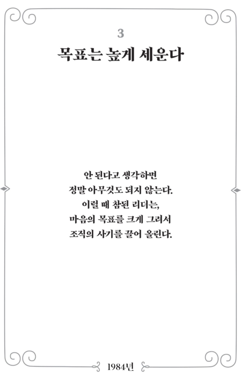 • 상황이 복잡할수록 오히려 더 중요한 것을 기억하고 중심을 단단하게 하는 것이 중요하다는 생각이 든다. 보편적인 판단 기준, 명확한 지침, 조직을 하나로 이끄는 그 목표!! 가장 중요한 것을 다시금 기억함으로 혼돈을 벗어날 수 있다.