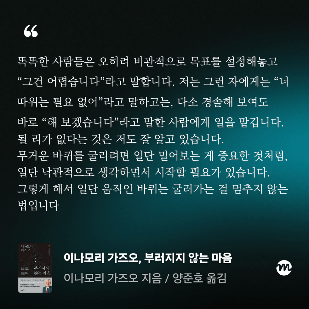 : 꼭 이뤄야겠다는 마음이 약한 나에게 부족한 태도와 정신을 생각해볼 수 있게 해준 책이었다.