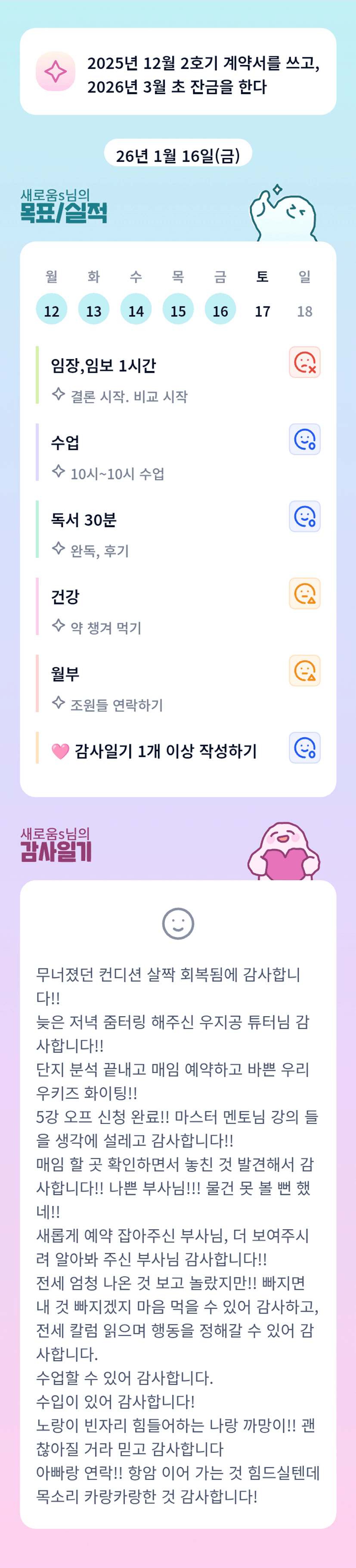 조장님 컨디션이 안좋으심에도 모든 일정 척척!! 열정과 성실함에 늘 놀라고 있어요~~ 전세 나간다 나간다!! 누구보다 잘 대응 하시겠지만 맘속으로 계속 응원보낼께용!! 💛