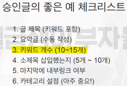 디어너스님 안녕하세요. 디어너스님 워프 설정은 잘되어있는것 같아요. 2000자 이상, 구조화, 쉬운목차, 글작성 주기도 강의대로 잘 따라오신것 같아요. 굳이 체크리스트에서 차이가 있는점은 키워드 갯수인거 같고, 전체적인 구조화 문제보단 주제의 문제일거 같아요.