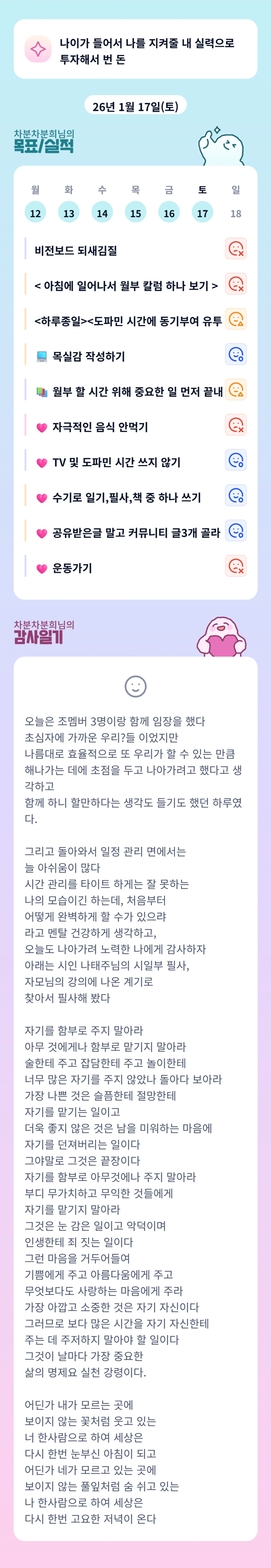 저는 오늘 임장다녀와서 일찌감치 기절 ㅋㅋㅋ 시간관리가 뭔가요.. 알고보니 체력 바닥이고 ㅠㅋㅋㅋㅋ 그나저나 '무가치하고 무익한 것들에 자기를 맡기지 말아라.. ' 는 저 문구 너무 와닿네요. 오늘도 고생 많으셨어요!! 주말도 열심히 산 우리 .. 스스로 칭찬해줍시다^^