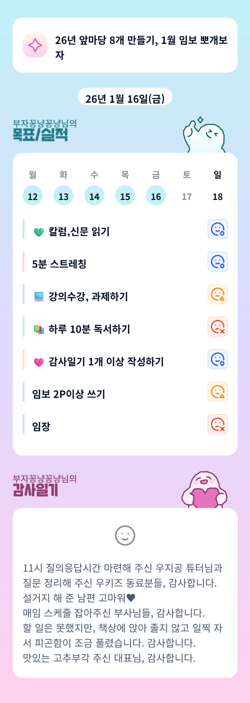 오늘은 꽁냥님이랑 이야길 많이 못해서 아쉬웠네요!! 고생 많으셨습니다!! 이번주도 화이팅!!