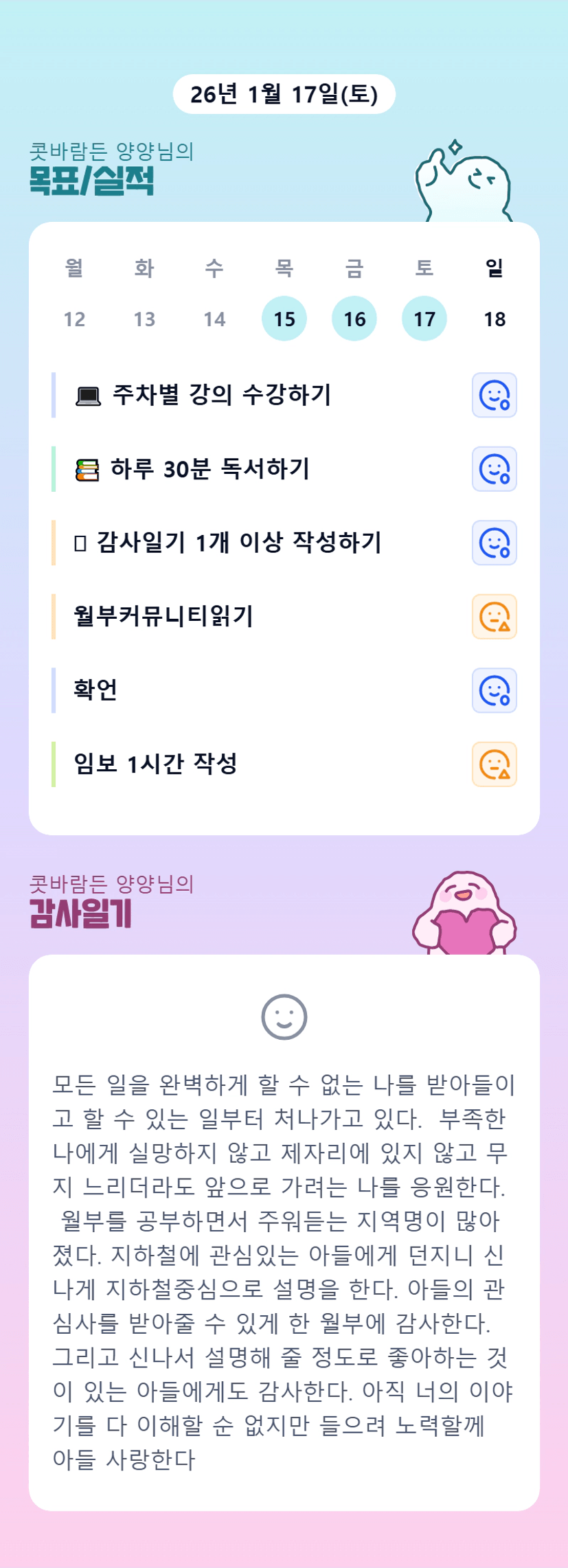 ㅠㅠㅠ아들이야기에 마음이 찡해지는 양양님의 감시일기네요. 마자요 자모님은 목실감에 나에대한 칭찬을 꼭 넣으신다고 했어요 ㅎㅎ 안그러면 내가 하는 게 별 볼일 없어 보일수 있게 느껴진다고! 꾸준히 남아있도록 칭찬계속 해줍시다~~ 고생하셨어요!!