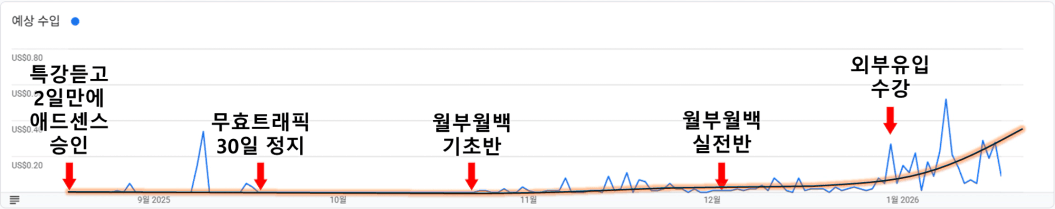 미약하지만 J자 커브를 그리고 있는 애드센스 수익을 보며 성장하고 있다는 것을 새삼다시 느낍니다.