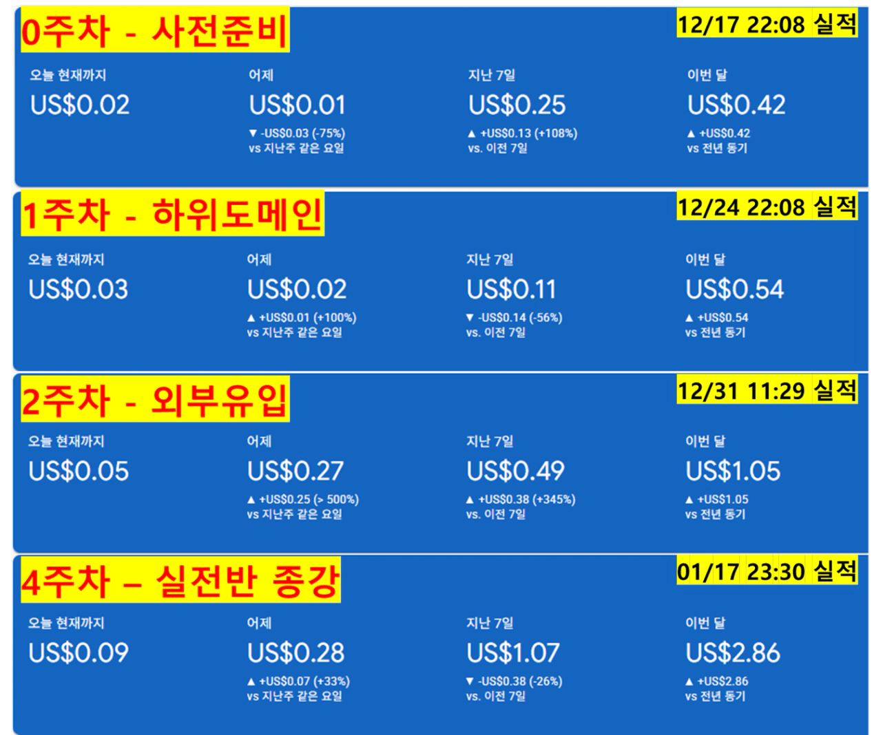 저의 실전반에서의 주차별 실적을 보면 지지부진 했던게 성장을 하는 모습을 볼 수 있습니다.