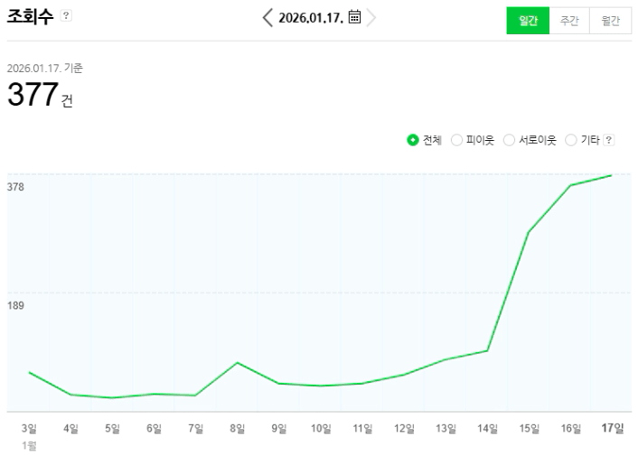 아래 제 네이버 블로그 조회수를 보면 1월초에 작성한 글이 1월 중순에 관심을 많이 받아 조회수가 늘어나며 제 워드프레스에도 유입 트래픽이 늘었습니다.