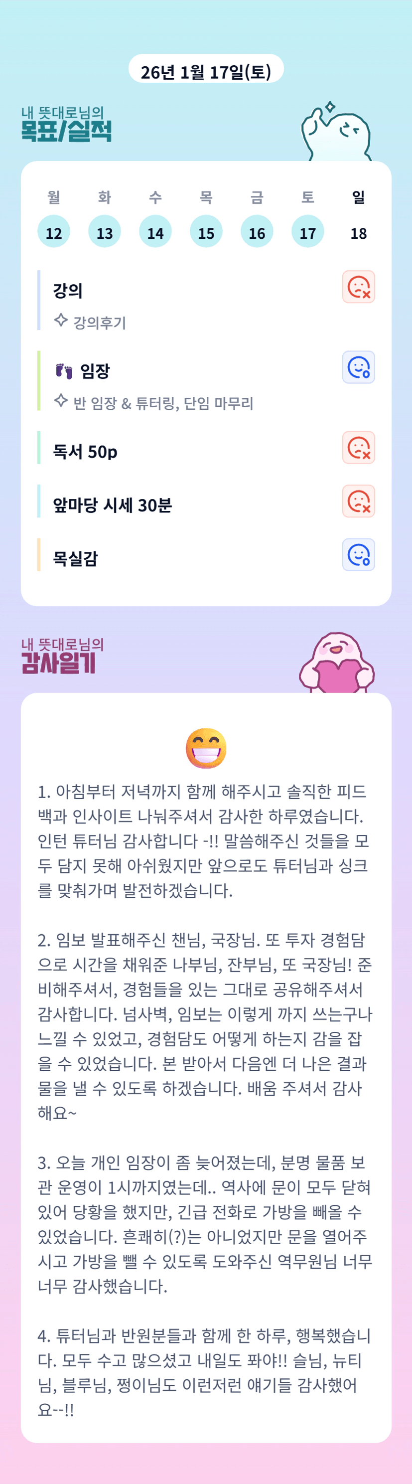 인턴 튜터님과 반원분들과 알찬 하루 보내셨군요 ㅎㅎ 앞으로도 파이팅입니다 !