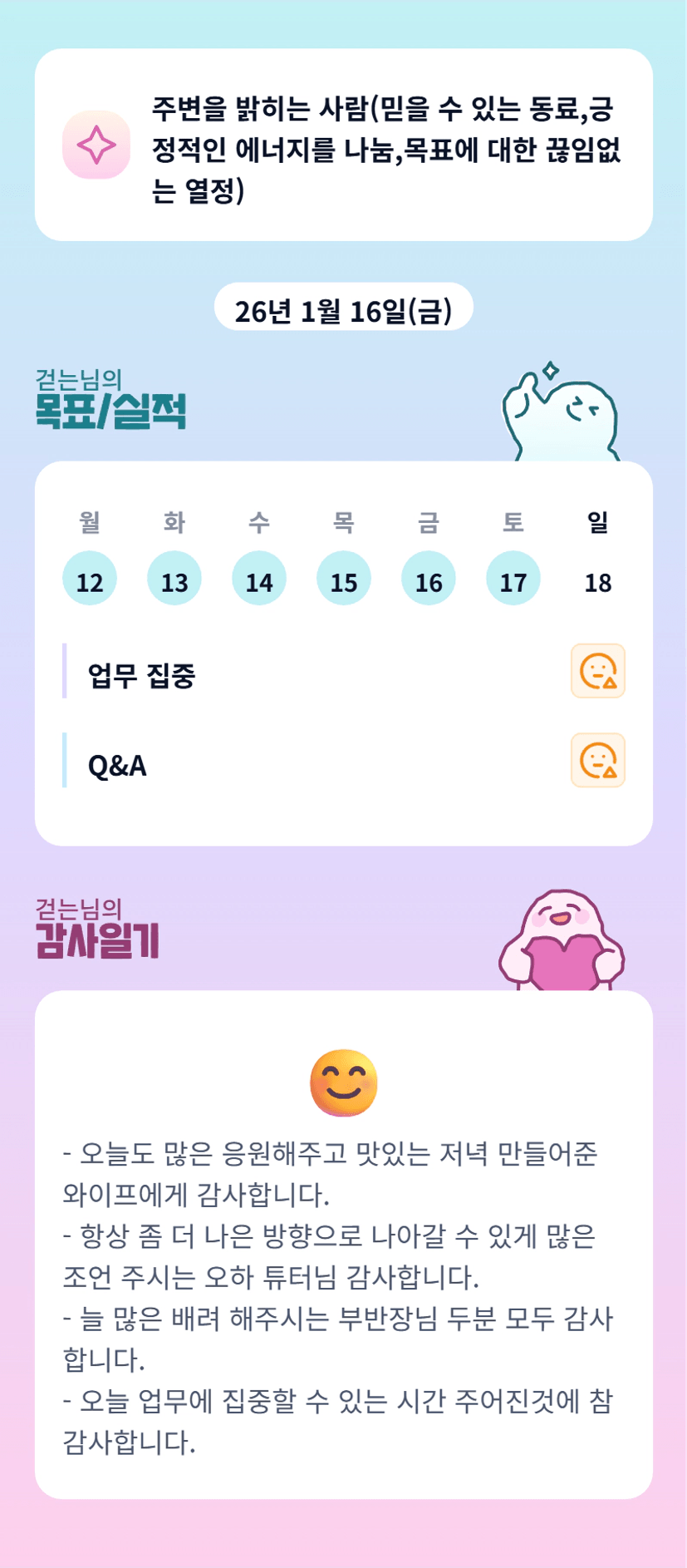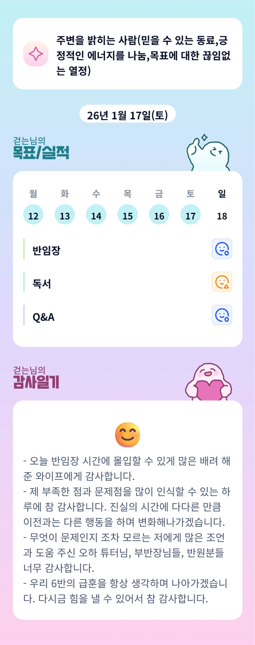 진실의 시간 벌써 오셨나요? ㅎㅎ 걷는님, 의미 잘 찾으면서 가실수있을거라 확신합니다!! 우리 걷는님 화이팅♡