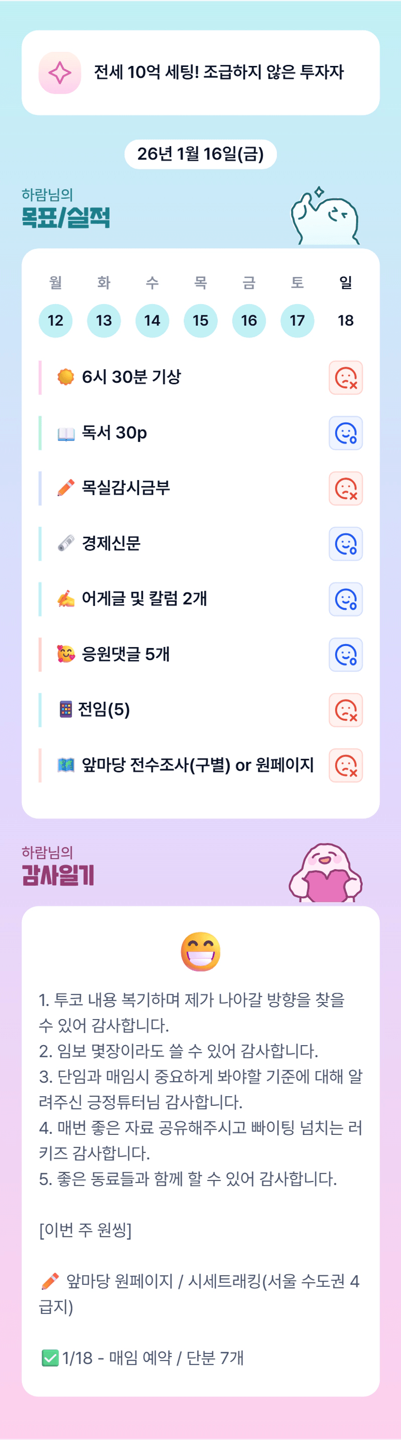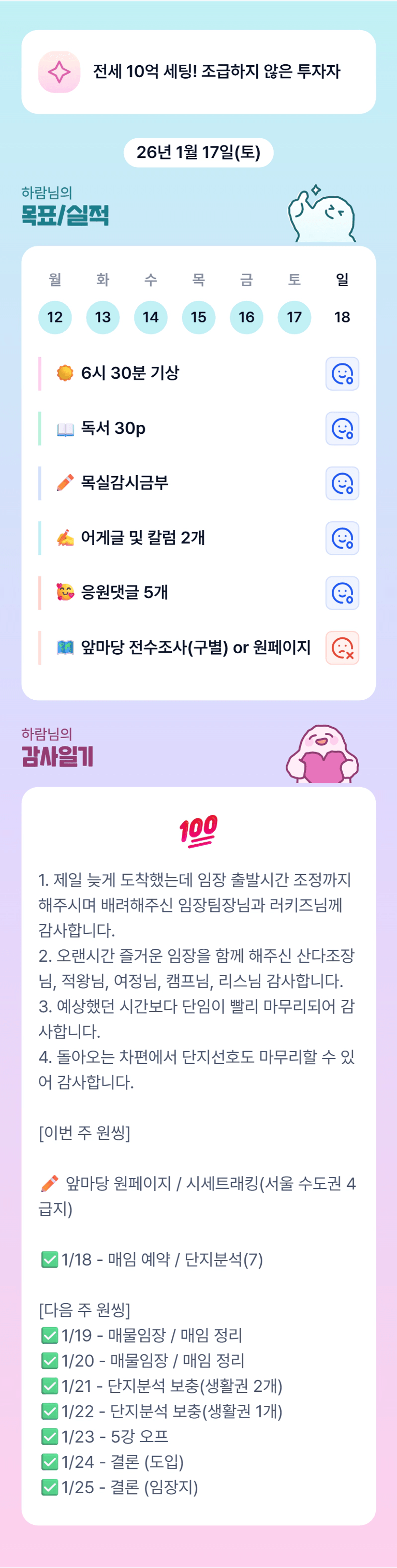 나는 새 임차인과 전세계약을 무사히 체결한다.나는 매일 성장하고 발전한다.나는 내 삶에 만족하며 행복할 자격이 있다.나는 상황을 감정이 아니라 차가운 머리로 판단한다.나는 10억을 감당할 만한 그릇을 갖출 수 있다.나는 부채는 두려워하지 않지만 통제하지 못하는 부채는 절대 허용하지 않는다.나는 항상 좋은 동료들과 함께 한다.나는 2030년에 순자산 10억을 달성한다.