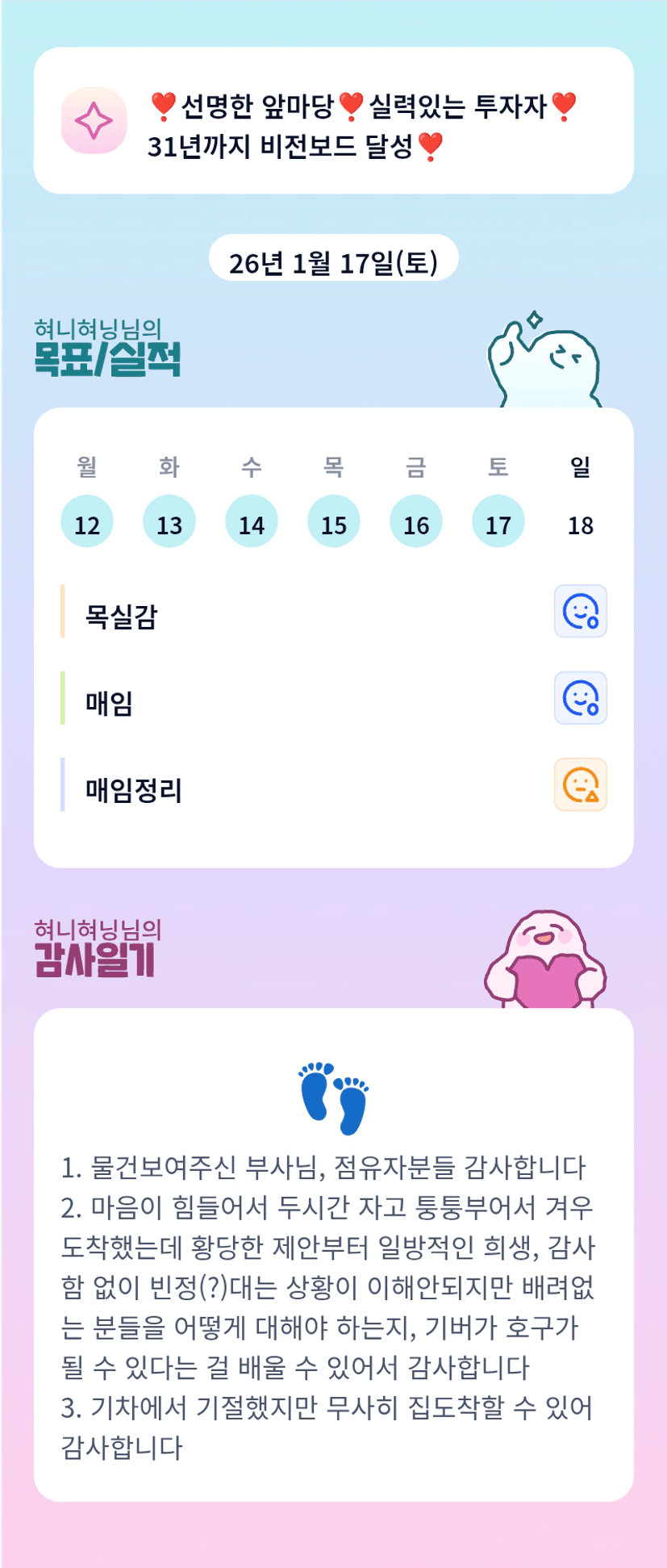 혀닝님 어제 하루 정말 고생많으셨어요! 마지막에 뵈어서 너무 반가웠어요! 신경쓰이시고 잘 풀리지 않는 일이 있으셨는데도 매임까지 다 해내시고 ㅠㅠ..!! 오늘 하루 만큼은 숨돌리는시간 꼭 가지시고 충전하실 수 있길 바라요! 메가혀닝 아자아자!