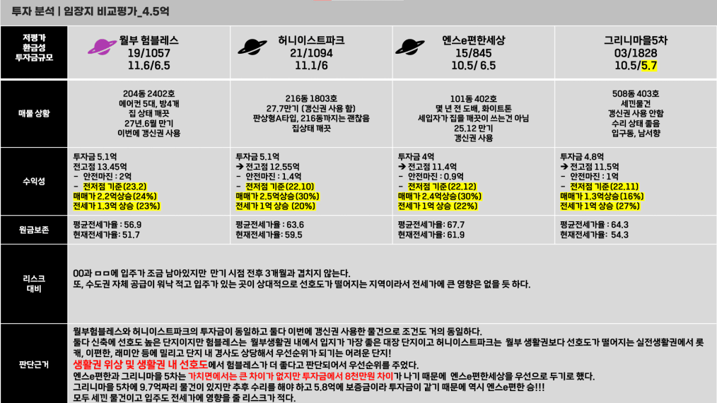 ex) A : 103동(선호동) 남향, 14층 5.5억 / 주인 거주 / 새로 세를 맞춰야 함 (4.3억)