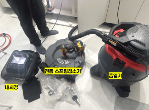 전동 스프링 청소기로 배관에 막힌 기름을 긁어내며 배수관을 청소합니다.