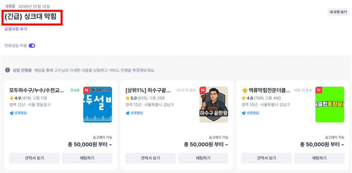숨고에서 싱크대 막힘으로 견적을 요청 하면 아주 빠르게 업체에서 견적서가 옵니다.