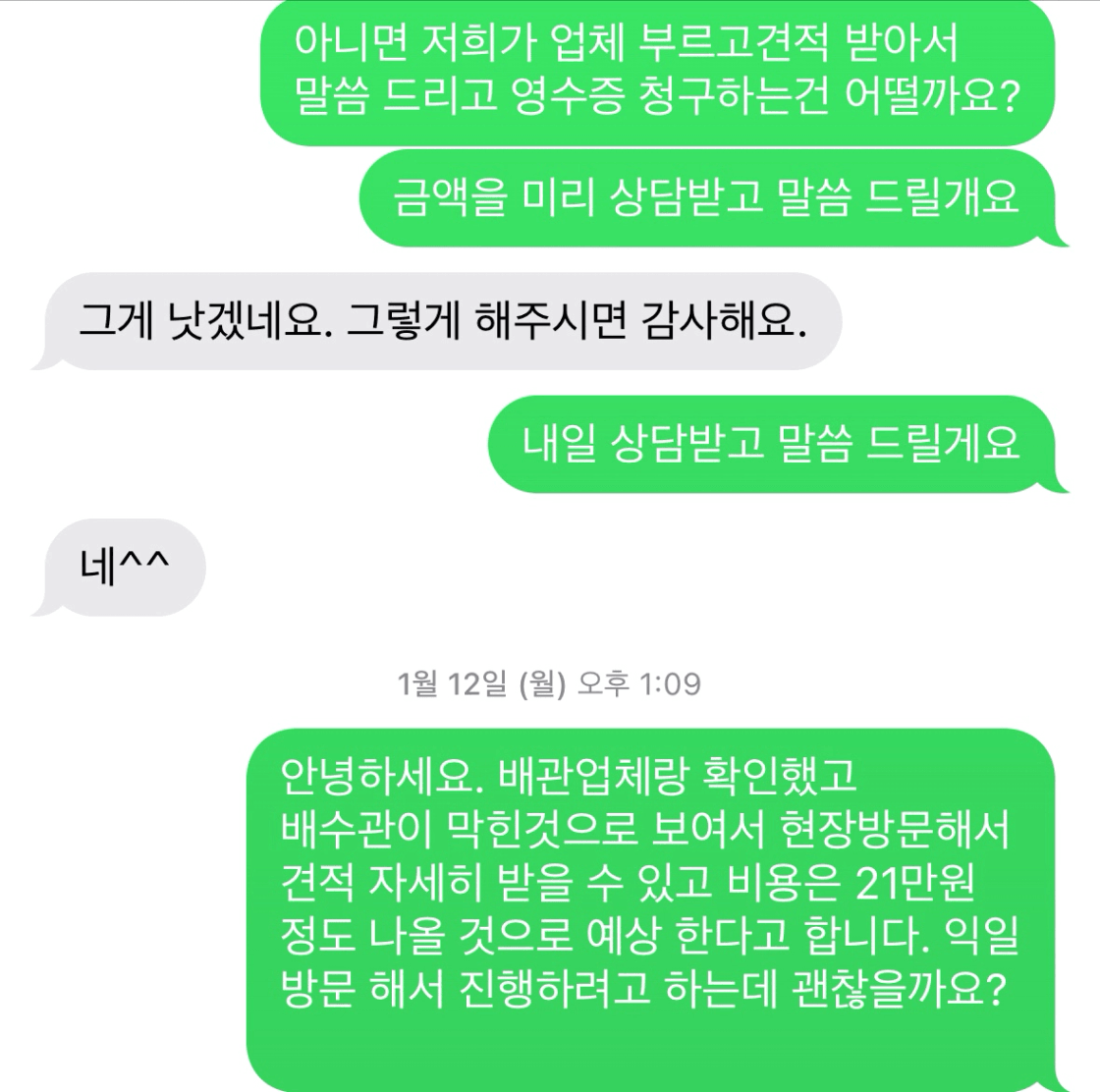 다음 날 인테리어 사장님이 아침 9시부터 집으로 방문해주셨고 배수관을 뚫어주셨습니다.