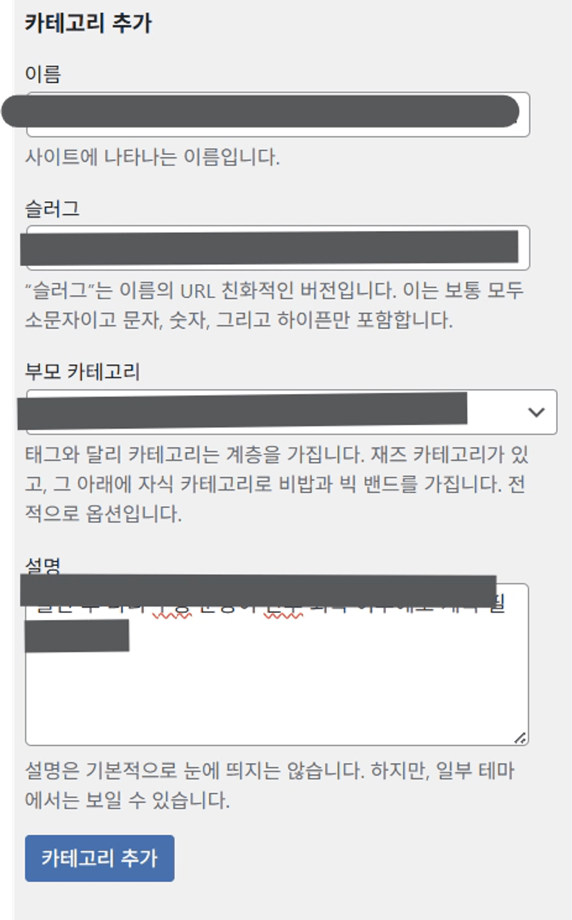 카테고리에서 주제를 추가하려는데요, 사진처럼 입력하고 “카테고리 추가”를 눌렀는데 저장되지 않고 화면이 멈춰있어요