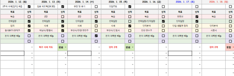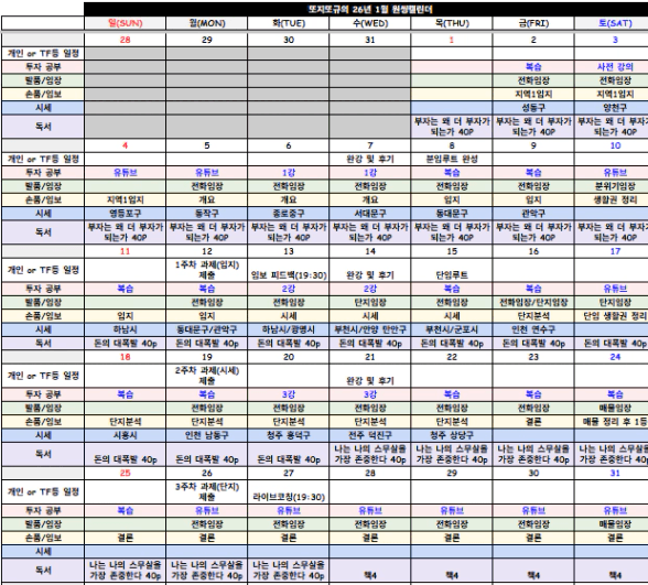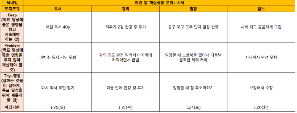 → 평균 5.65시간 정도 투자공부를 했다. 그러나 강의, 임보, 시세트래킹, 독서 등 중요 키워드와 루틴을 모두 놓친 일주일이었다. 근본적으로 여러 가지 핑계로 미모를 제대로 못해 새벽 시간을 확보하지 못한 게 가장 큰 이유였다. 핑계 대지 말고 다시 루틴을 찾아야겠다.