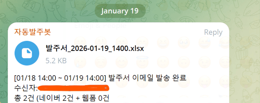 이제는 매일 스마트스토어와 거래처의 주문을 엑셀파일로 보내주는 소중한 프로그램이 되었습니다.