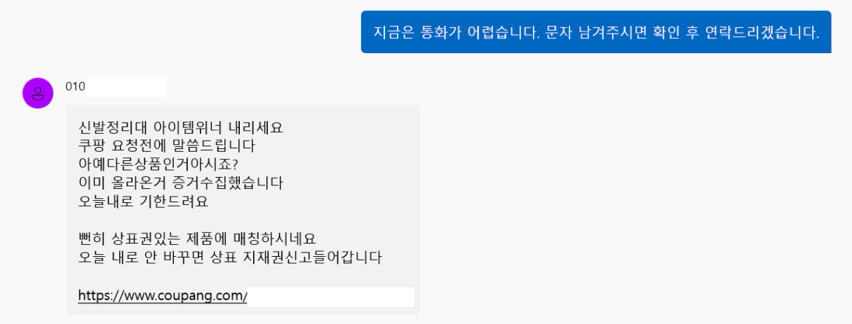 - 쿠팡에 올린 상품이 상표권을 침해했다는 문자를 타 판매자에게 수신