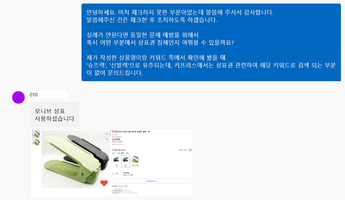 - 검색되는 부분이 없어서 판매자에게 침해한 키워드 문의