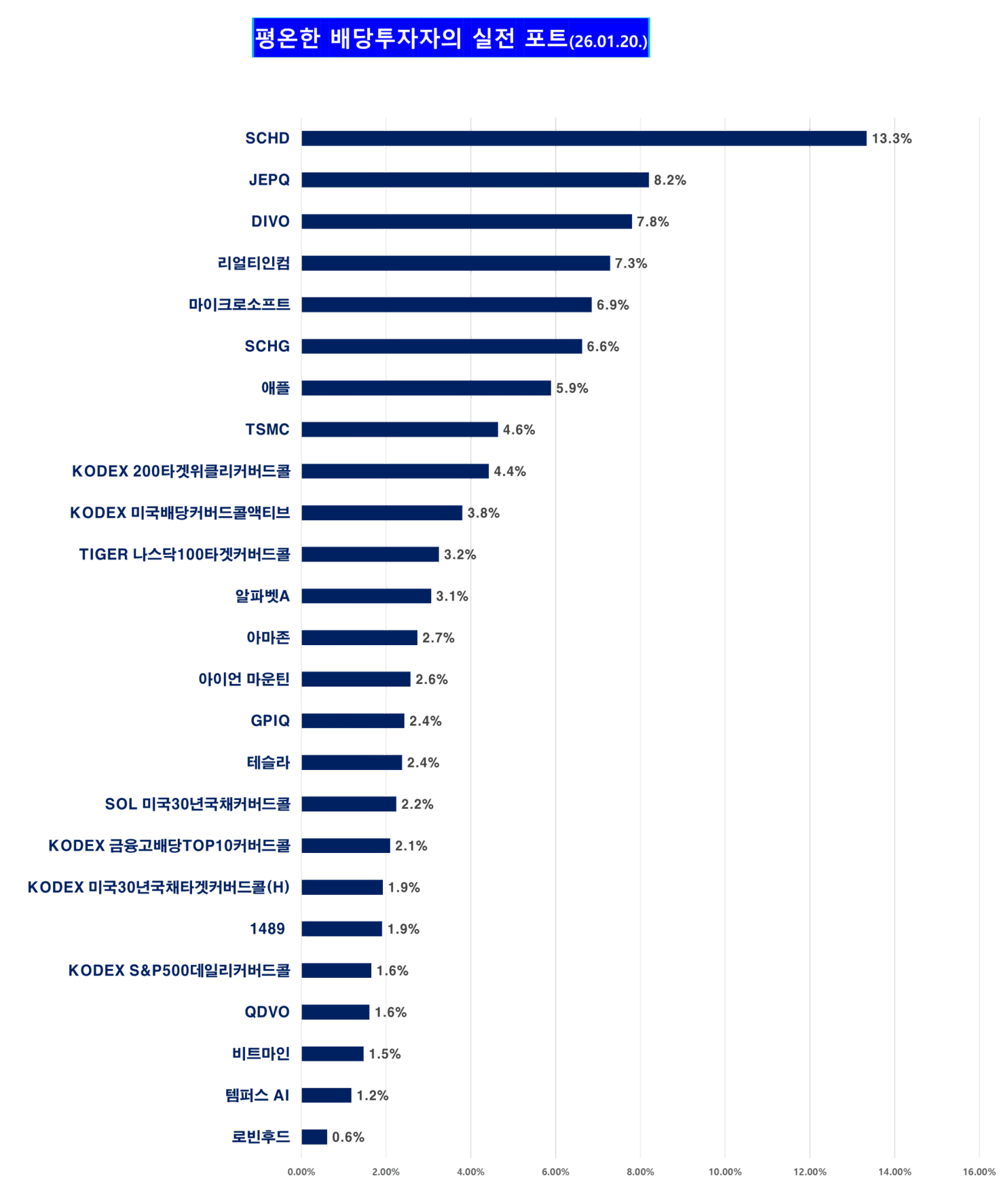 평온의 기준 (25. 12.20- 26.1.20)일 1월 20일 7시 30분 현재 프리장이 박살나고 있는 상태를 반영한 한달 수익률이 2.8%입니다. S&P500은 프리장 미반영 상태에서 0.89% 상승 중이니 이번달에도 S&P500을 2% 이상 정도 이겼다고 (비공인) 주장합니다.