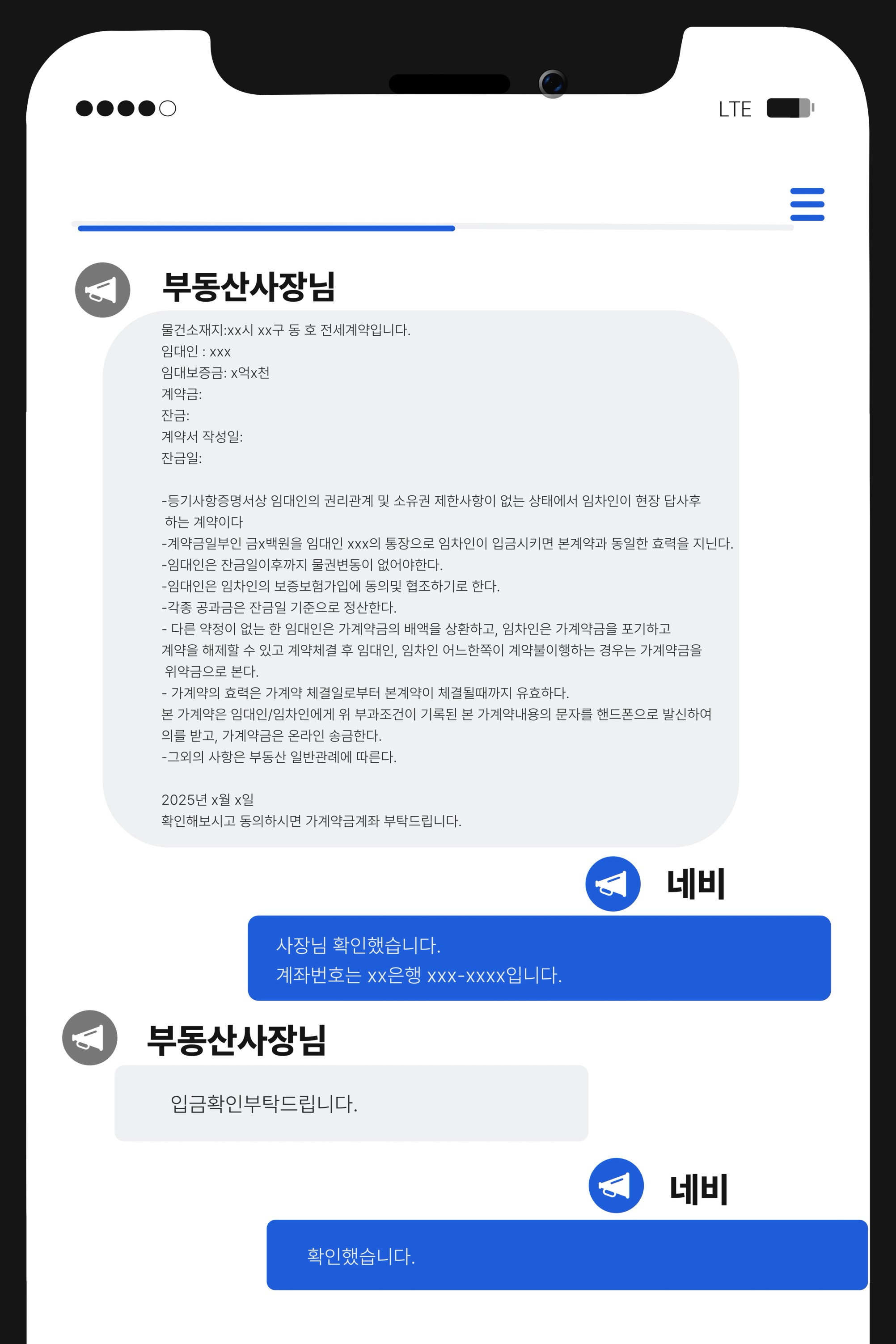 부동산 사장님: "네비씨 상대방 부동산에 말했는데, 상대 부동산 사장님이 중개하는 입장에서 자기도 임차인에게 면이 서야한다고 일단을 알겠다고 했는데, 계약하면서 전세자금대출 이야기는 내비칠것 같아.