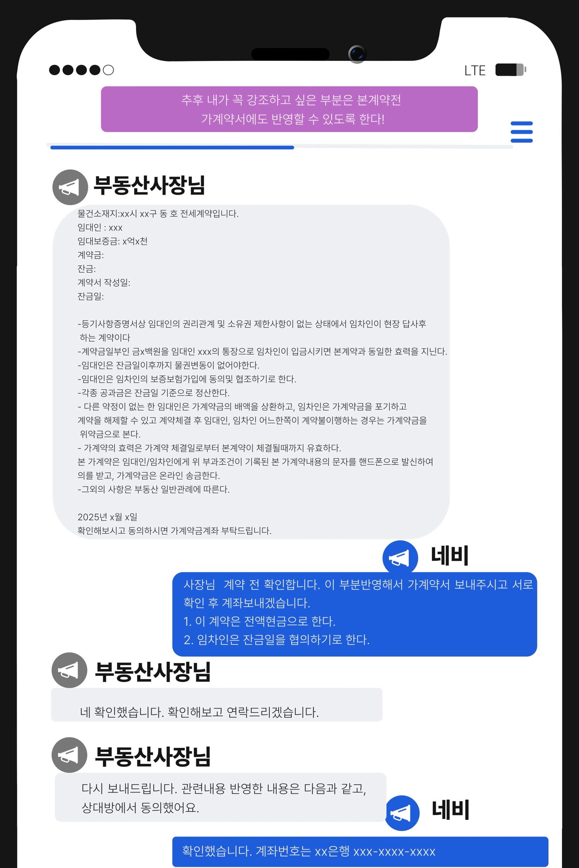 ▶️핵심 조건을 명문화: 구두로만 나눈 핵심 조건(현금 입주, 특정 입주일 등)을 가계약금 입금 전 문자 메시지에 포함한다.