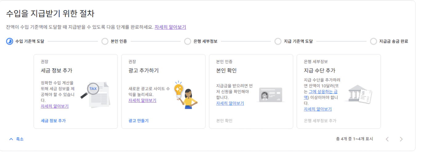 • 질문 내용 : 애드센스 수입 총액이 거의 10달러에 가까워졌는데요, 몇주 전부터 아래와 같은 문구가 뜹니다. 쭉 진행하면 되는 걸까요? 필수절차인지 궁금합니다.