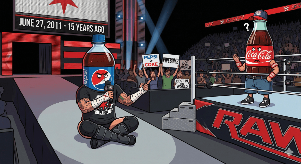 2011년 프로레슬링에서도 역사적 사건이 하나 있었다. 흔히들 ‘파이프밤pipebomb’이라고 부르는 이 프로모는 그 당시 ‘존 시나’라는 전통적인 영웅 캐릭터(코카콜라) 스토리에 지쳐있던 레슬링팬들 앞에 CM Punk라는 매니아층에게 지지를 받고 있는(펩시) 선수가 말빨 하나로(사실 설명이 길어서 ‘말빨’이라는 단어로 퉁치고자 한다.) 레슬링업계의 판도를 흔들어버린 사건이다. 그 프로모 이후로 CM PUNK는 미드카더라고 하기엔 좀 더 위상이 높고, 메인이벤터라고 하기에는 뭔가 좀 부족한 선수에서 존시나와 어깨를 견줄 만한 선수로 자리잡았다. 티셔츠 등 상품 판매량도 존 시나를 따라잡을 정도로 올라섰다. 존 시나라는 1등을 완벽히 넘어서진 못했지만 펩시 같은 자신만의 수요층이 탄탄한 강한 2등(혹은 1.5인자)의 자리를 차지했다. 그랬기에 지금도 현역에서 챔피언으로 군림하고 있는 것이다.