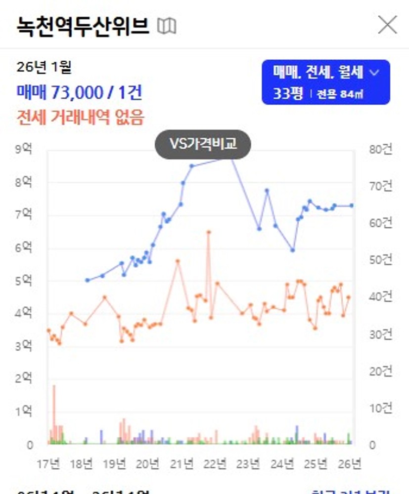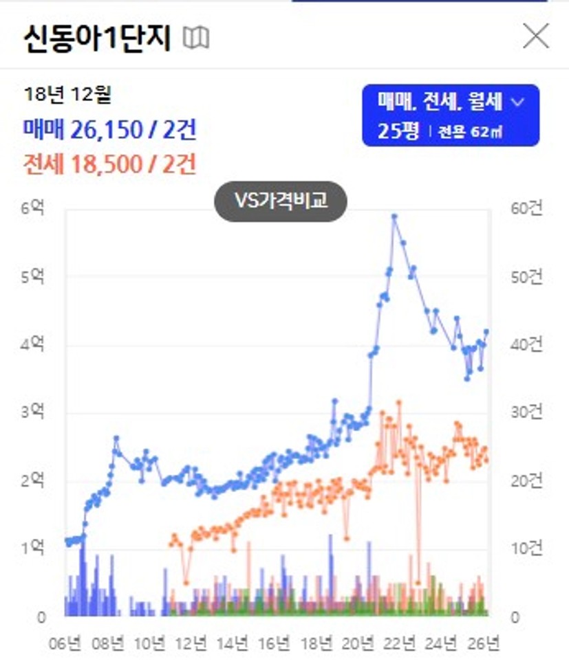 전고점 기준 4억, 현재 기준 2억 정도의 시세차익이 있습니다.