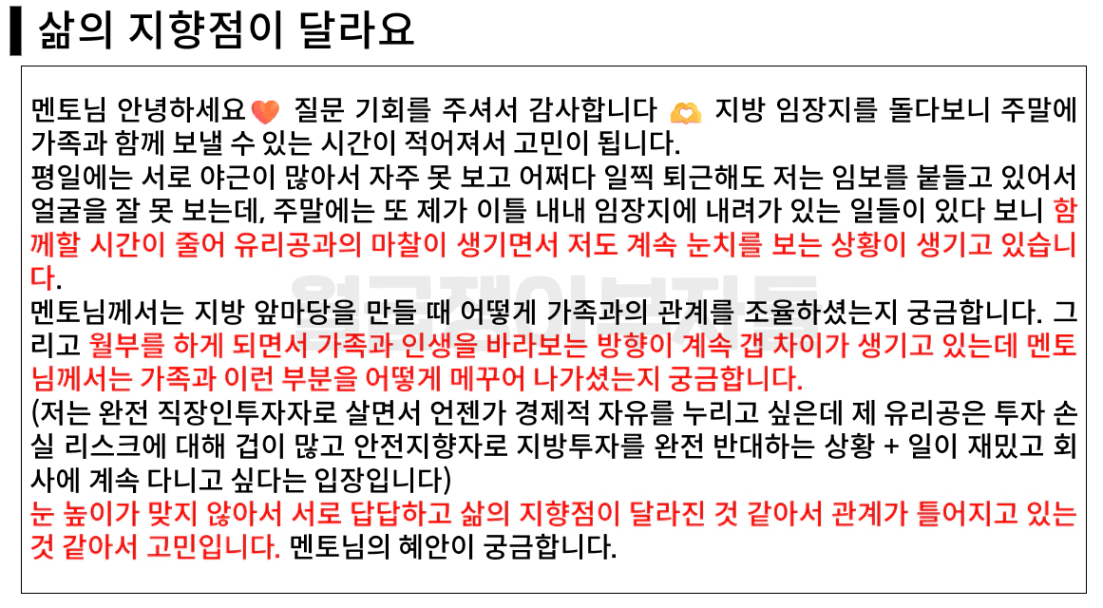 한 달 내내 투자 이야기가 아닌 ‘가족과의 갈등’만 여쭤볼 정도였습니다.