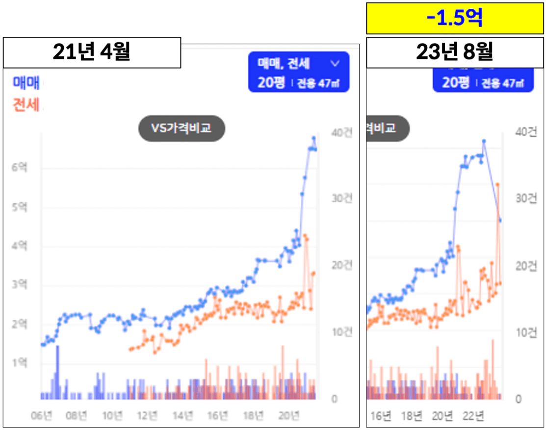 매수가보다 1.5억 하락 거래가 찍혔습니다.