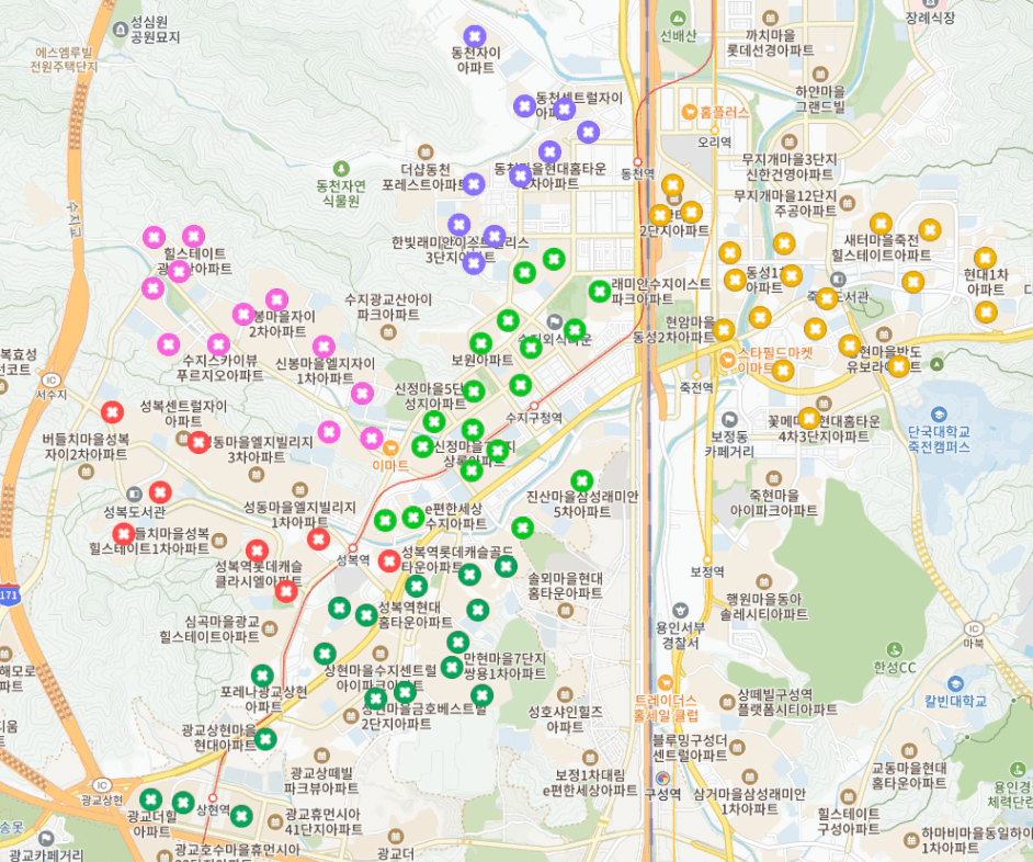 총 100개의 단지로 정리가 되어있고, 풍덕천동/성복동/상현동/신봉동/동천동/죽전동 6개 동의 단지들을 색상을 구분하여 표기해두었습니다!!