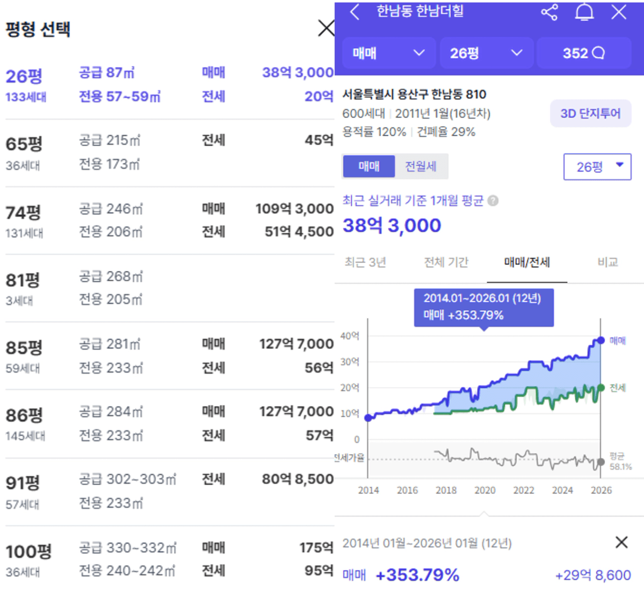 방2개 화장실2개인 26평은 현재 실거래가 38억까지 갔습니다.