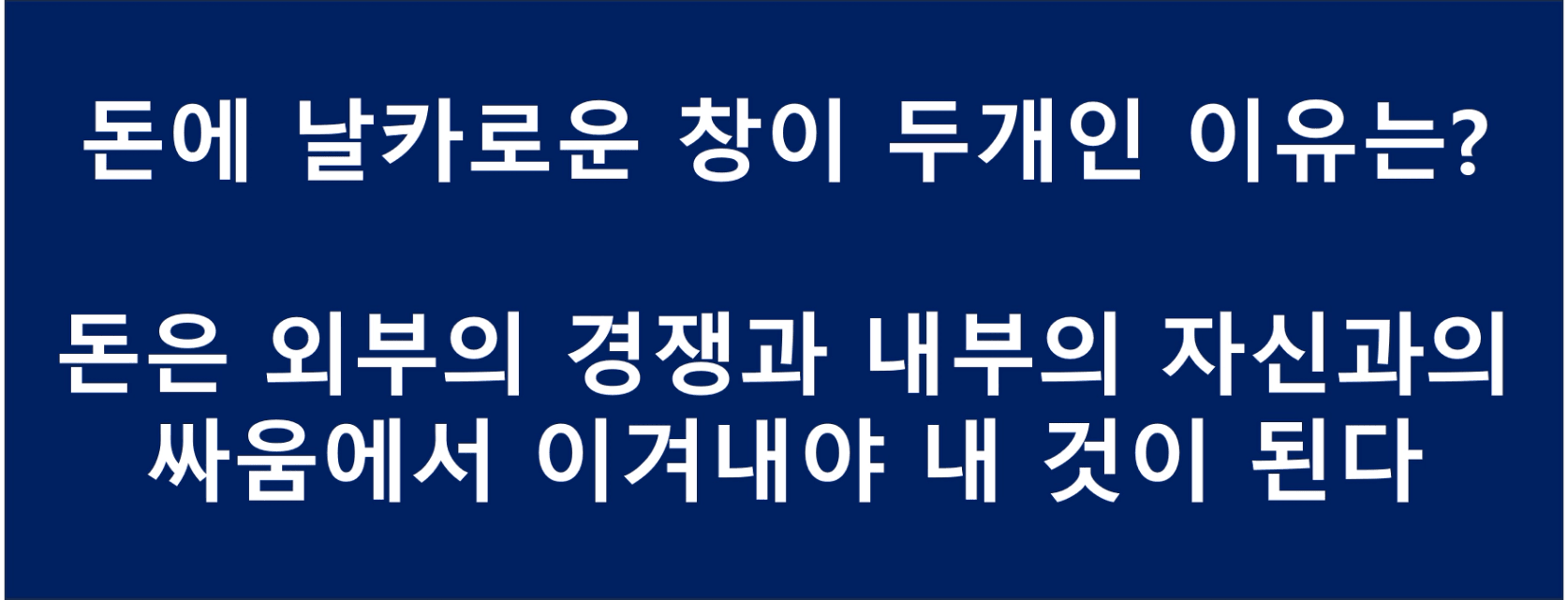따라서 돈을 벌기 위해서는 외부의 적에게 날카로운 창을 써야 하지만, 내부의 적(내 마음속의 탐욕과 공포)도 날카로운 창으로 이겨내야 합니다.